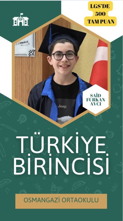 Okulumuz öğrencilerinden Said Furkan AVCI LGS sınavında 500 tam puan alarak Türkiye şampiyonu olmuştur. Öğrencimizi başarılarından dolayı tebrik ediyor devamını diliyoruz. Gurur tablomuza resimlerden ulaşabilirsiniz.